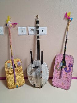Koras Mômes - Récup et Musique - Acrylique, feutres, pistolets à colle, cartons, et fil Nylon sur barquettes et cartons. ALSH Noël 2022, Montpellier; Récupération des barquettes de la cantine scolaire, des branches, et bambous secs dans la nature pour fabriquer des Koras. Production individuelle, aide et produit personnalisés. Par la suite un spectacle de musique pour les parents a été réalisé.